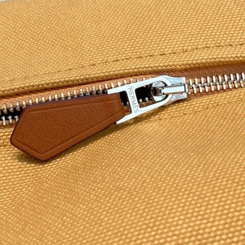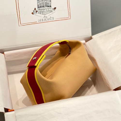 The beauty of this Hermès Bride-a-Brace large case lies in its striking and versatile design. Created from canvas, it is added with a bi-colored handle that can be buttoned inward and the logo detailing on the front offers it a touch of exclusivity. The lined interior of the bag is secured by a zipper closure at the top.