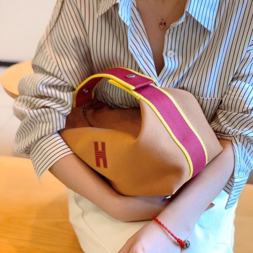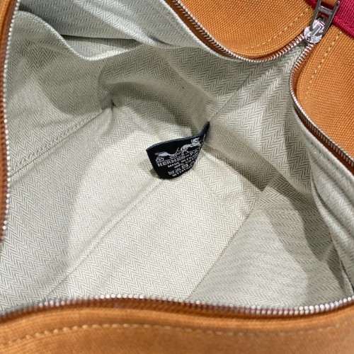 The beauty of this Hermès Bride-a-Brace large case lies in its striking and versatile design. Created from canvas, it is added with a bi-colored handle that can be buttoned inward and the logo detailing on the front offers it a touch of exclusivity. The lined interior of the bag is secured by a zipper closure at the top.