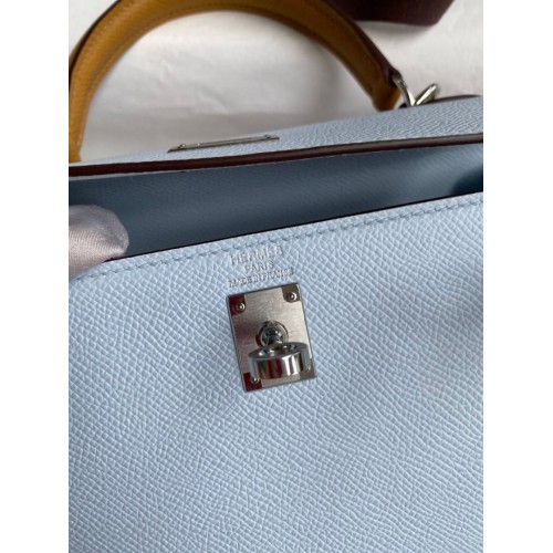 Replica Handbag Store Kelly Sellier 25 Bicolor Bag in Pearl Grey and Blue Mysore Goatskin