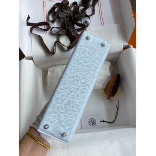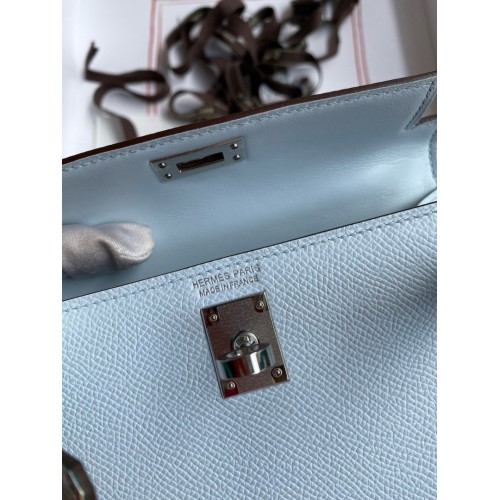 The initial release of the Mini Kelly II was met with sensational demand that has not waned in the years since. Replica Handbag Store has kept production of these coveted Sellier Kelly's extremely limited, releasing small batches in a range of colors that seem to change each season. This very rare Store Fresh example is rendered in three colors, blue brume and green Epsom leather with sesame leahter handle. It's enriched by the sparkling palladium hardware, a luxurious little bag.