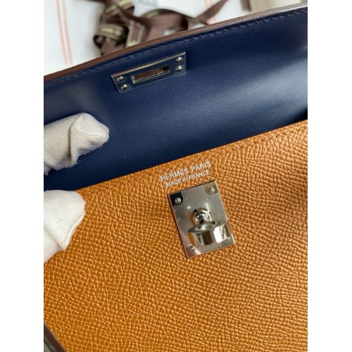 The initial release of the Mini Kelly II was met with sensational demand that has not waned in the years since. Replica Handbag Store has kept production of these coveted Sellier Kelly's extremely limited, releasing small batches in a range of colors that seem to change each season. This very rare Store Fresh example is rendered in three colors, blue brume and green Epsom leather with sesame leahter handle. It's enriched by the sparkling palladium hardware, a luxurious little bag.